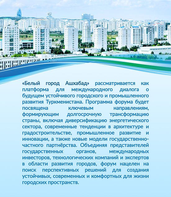 Форум объединяет государственные структуры, международные организации, инвесторов, архитекторов, инженеров и технологические компании для обсуждения следующего этапа развития Ашхабада и «умного» города Аркадаг.